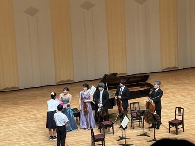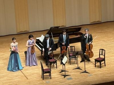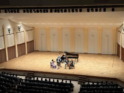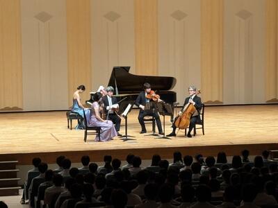 あいにくの雨模様の中、アワーズホール・明石市市民会館大ホールにて令和7年度の芸術鑑賞会が行われました。今年は音楽で「N響メンバーによるピアノクインテット」を鑑賞しました。ヴァイオリン、ヴィオラ、チェロの弦楽器で奏でる美しい優雅な響きと、ピアノを加えたダイナミックな演奏。クラシックのみならずジャンルを超えた音楽を存分に楽しむことができました。演奏後に、生徒会長よりお礼の言葉と、副会長から花束が贈呈されました。