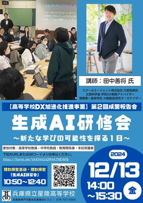 【高等学校DX加速化推進事業】の趣旨を受け、急速に発展する生成AIの教育現場における効果的な活用方法を学ぶための生成AI研修会を開催いたします。本研修会では、生徒の学びをより深めるために生成AIがどのように活用できるか、その可能性について理解を深めていきたいと考えています。ぜひご参加ください。