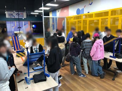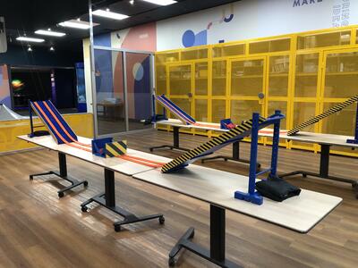斜面を落ちる車の衝撃をどのようにして和らげるかを取り組みました。