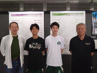 39年ぶりの出場となった近畿大会。39年前に出場したOBの方達も応援にかけつけてくれました。写真を掲載させていただきます。4人が写っている写真のうち一番右が堀田さん(現県立夢野台高校バスケ部監督、当時のキャプテン)、一番左が平松さん(当時の副キャプテン)です。応援に来ていただき本当にありがとうございました。なお、選手の右がキャプテンの堀田(3年)、左が副キャプテンの橋ケ迫(3年)です。